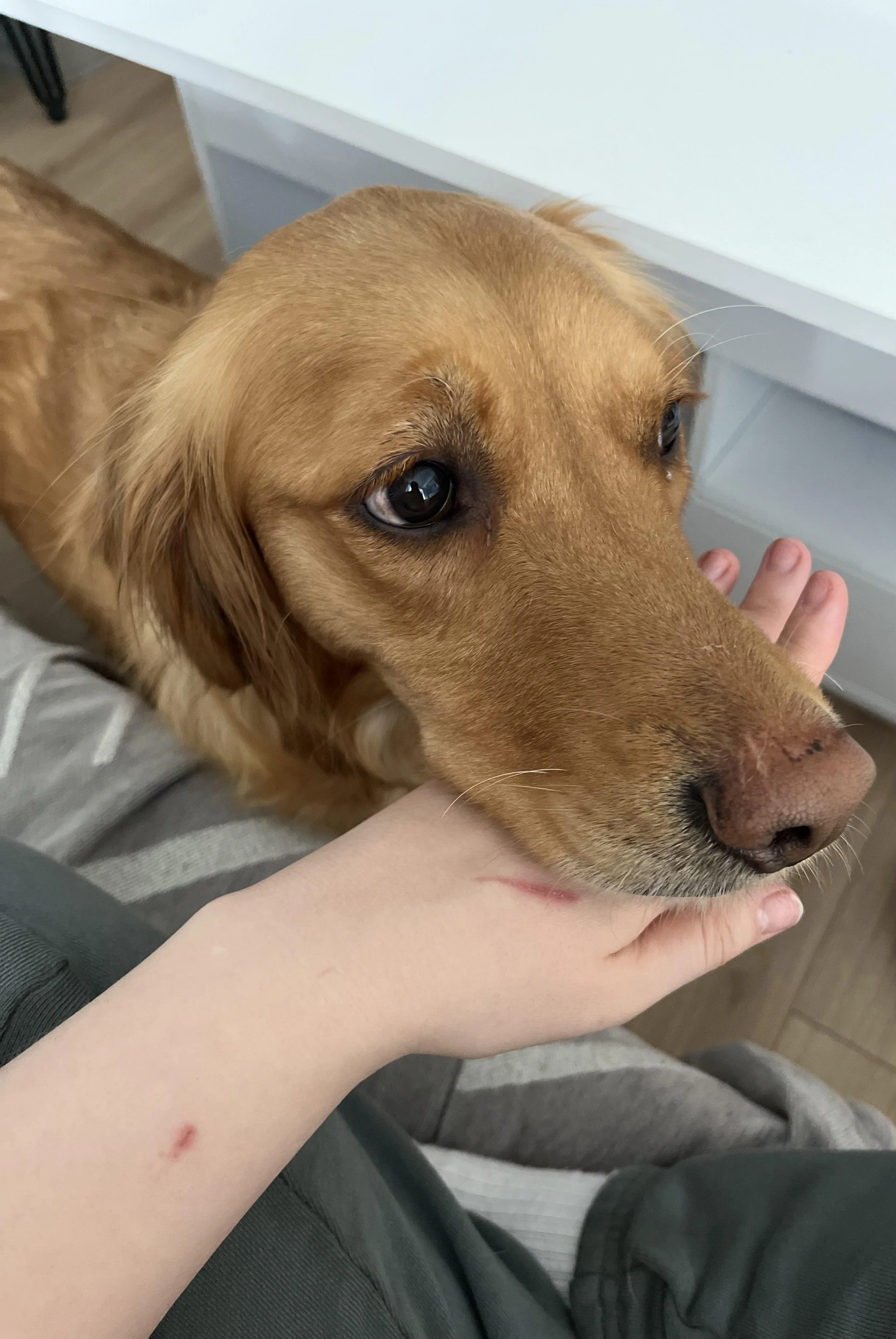 A dog can be trained to paw, nudge, and lick to stop you from harmful behaviors such as nail biting, hitting themselves, and picking at your skin.